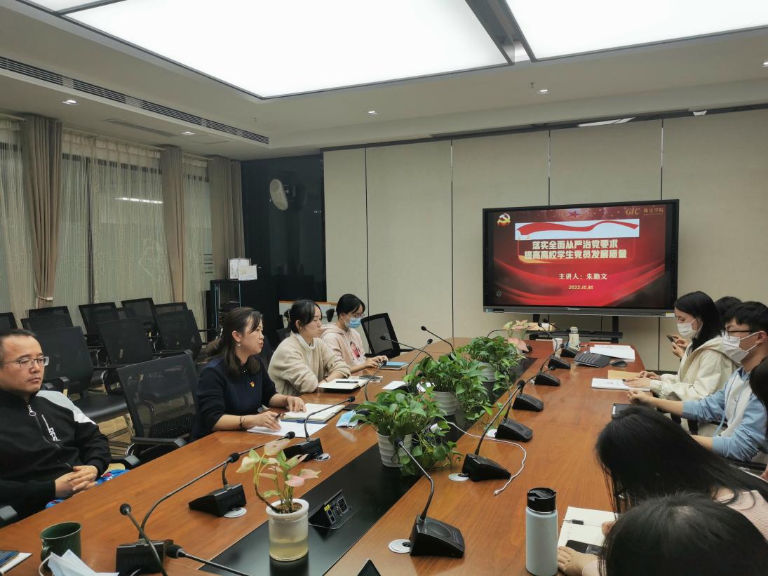 近日,beats365官方网站举行第一期“学习二十大,奋进新征程”系列主题教育活动,公司特邀组织员朱勤文老师讲授题为《落实全面从严治党要求 提高高校员工党员发展质量》的专题辅导报告。公司党支部全体委员,员工党员骨干、辅导员参加报告会,报告会由公司党委副书记陈汉英主持。