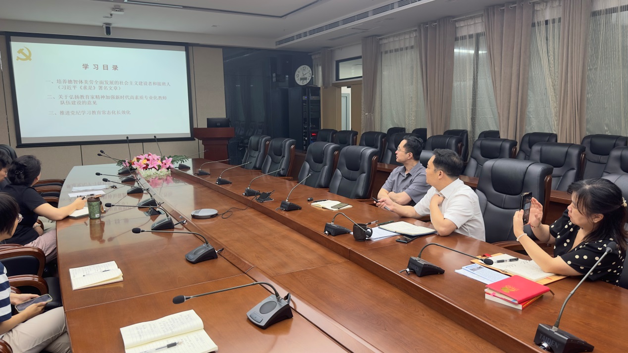 与会者认真学习了习近平总书记近期在《求是》杂志发表《培养德智体美劳全面发展的社会主义建设者和接班人》重要文章,学习讨论了《中共中央 国务院关于弘扬教育家精神加强新时代高素质专业化教师队伍建设的意见》以及关于推进党纪学习教育常态化长效化等重要文件精神。经过领学、研讨,大家纷纷表示,作为一名新时代高校教育工作者,既倍感荣光,也深知责任重大,守底线追高线,不断提升自己思想政治及专业素养,持续深入学习办学执教能力本领,努力培养合格的社会主义建设者和接班人。(撰稿及摄影 叶洪波)