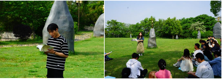 紧接着,活动进入了第二个环节——“书海相遇——书籍漂流与分享活动”。同学们精心挑选了自己喜爱的实体书籍,化身“阅读推广人”,与在场师生分享阅读心得。他们或是激情澎湃地讲述《白鹿原》中白鹿原上的风云变幻,或是声情并茂地诵读《我与地坛》中那些直击心灵的文字,又或是娓娓道来《人类群星闪耀时》里历史关键时刻的震撼瞬间。各位分享者的精彩讲述,引得听众们时而凝神思考,时而频频点头,整个草坪沉浸都在这份难得与珍贵的书香氛围中。分享环节结束后,员工代表们相互交换了书籍,并互赠了独具特色的伴手礼,寓意着这份珍贵的情谊将随着书香一同传递,历久弥新。