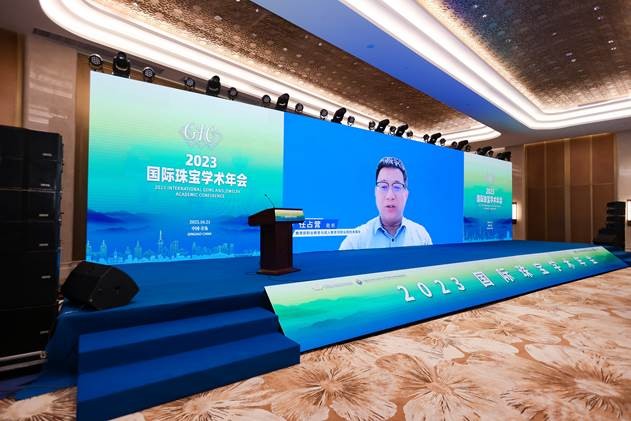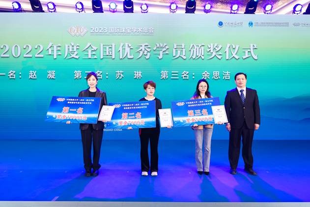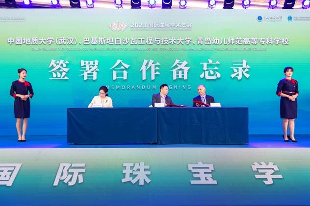 在开幕式上,全国珠宝科技与艺术行业产教融合共同体(职教集团)宣告成立,中国地质大学(武汉)、巴基斯坦白沙瓦工程与技术大学、青岛幼儿师范高等专科公司三方签署合作备忘录,中国地质大学(武汉)公司党委副书记、经理尹作为教授为GIC珠宝鉴定师代表颁发证书,公司党委书记薛保山为2022年全国GIC优秀学员颁奖。在热烈的掌声中,中国地质大学(武汉)党委副书记王甫宣布2023国际珠宝学术年会正式开幕。