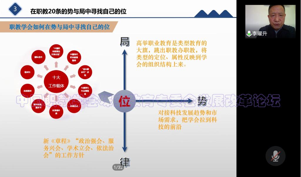 特邀嘉宾李曜升教授在题为“用战略思维理解把握“职教20条”的局、势、律”的主旨报告中指出,要用战略思维理解和把握党的十九大精神,同时也要用战略思维把握“职教20条”的局、势、律。局——就是高举职业教育是类型教育的大旗,跳出职教办职教,将类型定位、属性反映到学会、专委会的组织结构上来;势——就是对接科技发展趋势和市场需求,把学会、专委会拉到科技前沿;律——就是按照新《章程》办会,坚持“政治强会、服务兴会、学术立会、依法治会”的工作方针。各级公司要在“职教20条”的坐标中找准自己的位。