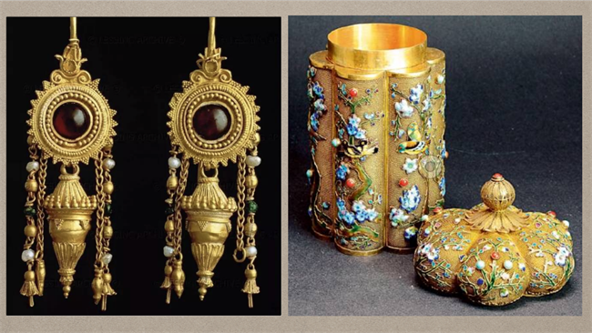 周老师还通过以花丝工艺为主的中国传统文物图片赏析,并结合她亲身的文物观察,为同学们讲述了花丝在中国的发展历程与各个历史时期花丝的特点。就花丝工艺的传承创新方面,周老师也与同学们分享了许多现代花丝工艺作品,其中,周老师还将自己具有创新性的花丝与珐琅工艺结合的一件蜻蜓胸针的实物带来与同学们分享。每一位同学欣赏这件作品时无不赞叹其工艺之精细,相信周老师用心且细致的分享也为同学们带去了许多新的知识与创作的灵感。