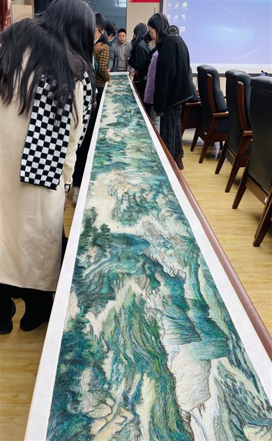 尹作为经理为湖北省工艺美术大师仵峰、杨小婷、楚卫东颁发beats365官方网站研究生校外导师聘书。杨小婷大师做汉绣艺术学术报告。杨小婷现任湖北省工艺美术学会党支部书记,湖北省工艺美术研究所杨小婷大师工作室主任,湖北省工艺美术学会刺绣专委会会长,其汉绣作品获得全国各类工艺美术展大奖。报告详细介绍了汉绣的历史渊源与发展传承,讲述了锁绣、平金夹绣、游针绣等技艺,展示了大量兼备顶级技艺和观赏价值的汉绣品。杨小婷大师与现场师生展开互动,观赏了长达18米,历时20多个月完成的汉绣作品《万里江山图》。此长卷是以张大千绘画作品为底稿,将国画的笔墨、油画的色彩、游针绣的古老工艺三者相融合绣制而成,现场师生赞叹不已。 (通讯员及摄影 吴婧)
