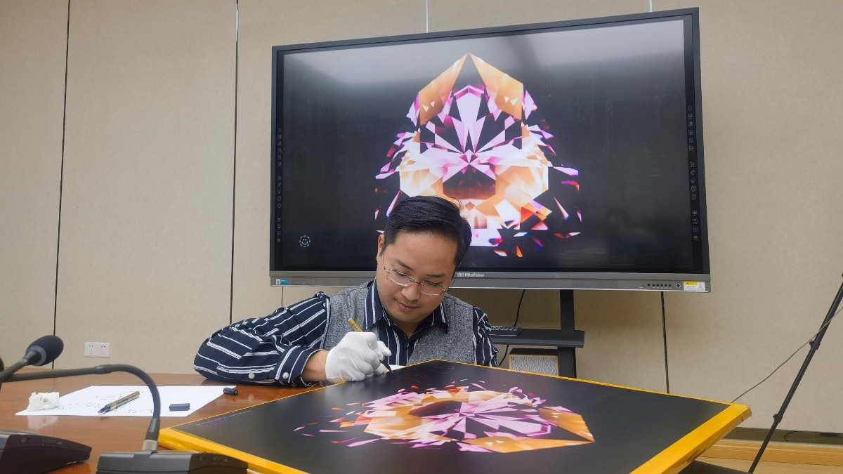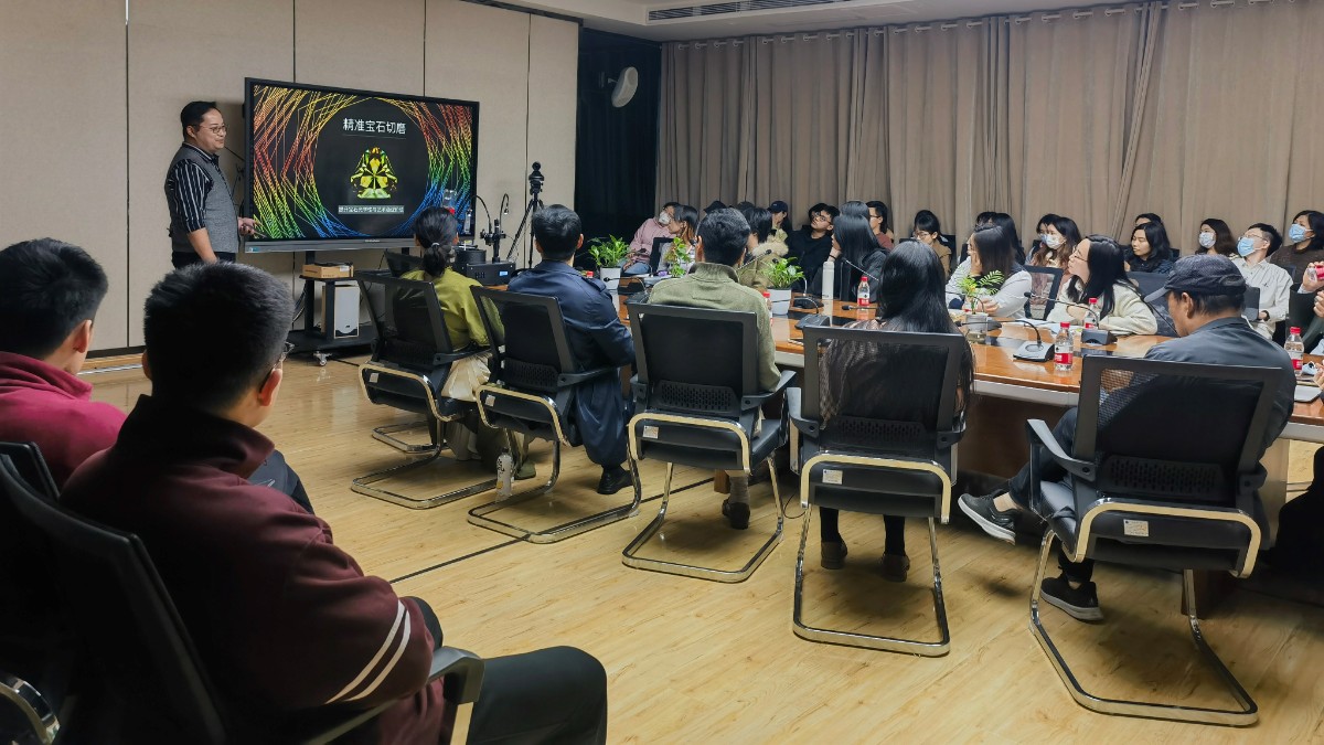 胡乃尹先生从自身经历与感悟出发,结合全球宝石切磨产业发展现状,从宝石切磨的本质与目的、宝石切磨工艺、市场与艺术价值以及追求极致工艺的价值体现等四个方面为师生讲解他在宝石切磨领域的开创性工艺与技术。胡乃尹以自主研发的宝石切磨设备切入,提出“设备”、“技术”和“人心”三要素相互配合,介绍了光学等科学理论在宝石切磨工艺中的核心价值,分享了宝石切磨艺术作品的创作内涵,将当代科学与艺术融为一体,诠释他所追求的极致美。