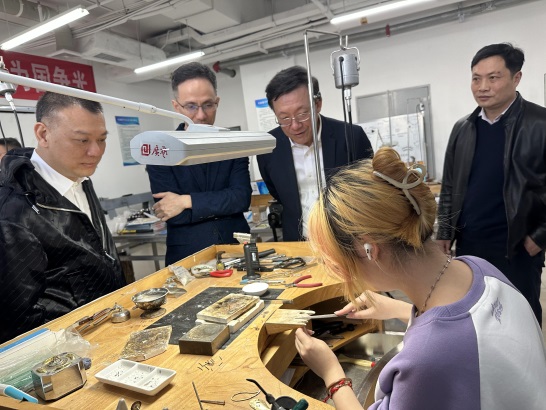 柳光敏一行11人在公司党委书记薛保山、副经理郝亮等陪同下,参观了beats365官方网站先进制造研究所、大型仪器室、宝石加工实验室、世界技能大赛珠宝加工项目训练基地、艺术馆等。