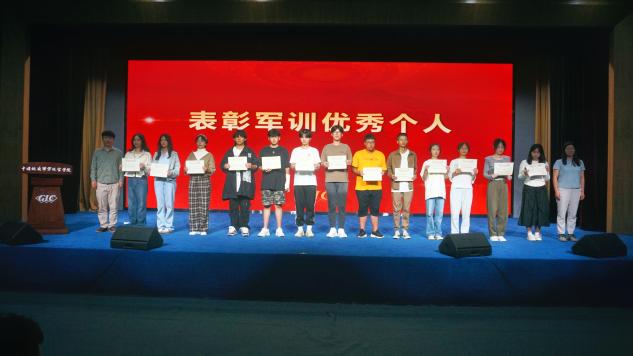 曹佳乐老师宣读了军训表彰结果,获得军训优秀个人的同学分别是:杜芊影、李静怡、刘晓霏、林菲、王怡倩、郭冰洁、彭宇晴、郝孝涵、刘新宇、敖汉斌、万泽千、罗洋洋、刘华亮。获得优秀内务个人的同学有陶雨欣、刘雅婷。优秀内务寝室分别是53栋105 、106和63栋421。全场同学以热烈的掌声祝贺获奖同学和团体。杨钊老师与余静老师为同学们颁发证书。