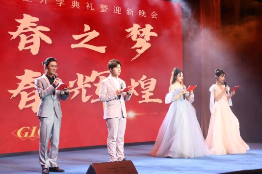 成青春之梦,创青春辉煌。在师生们热切的期待中,在绚烂的灯光下,员工主持人宣布迎新晚会正式开始。