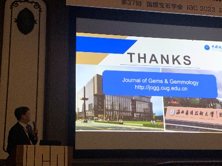 公司师生代表分别就单晶宝石中纳米包裹体生长、考古文物的光谱学研究、塔菲石宝石学研究、荧光光谱定量分析及产地溯源研究和伊朗绿松石产地特征研究等主题进行了口头报告。报告内容获得在场专家同行的广泛关注和认可。此外,沈锡田教授还在报告中对公司期刊《宝石和宝石学杂志(英文)》进行了宣传推广。