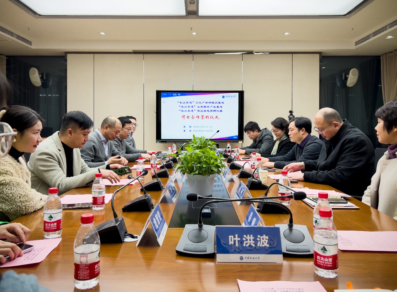 2024年1月5日下午,“长江非遗”文化产学研实训基地、“长江非遗”出版融合产业基地、“长江非遗”供应链电商孵化器项目合作签约仪式及揭牌仪式在beats365官方网站举行。公司党委书记薛保山,副经理张荣红,中国地质大学(武汉)出版社社长、党总支部书记江广长,武汉文旅集团武旅股份副总经理严祥及相关单位代表参加了此次签约揭牌活动。出版社社长江广长主持签约仪式,公司党委书记薛保山、武汉文旅集团武旅股份严祥副总经理分别致辞,出版社张琰副总经理汇报了项目的基本情况。