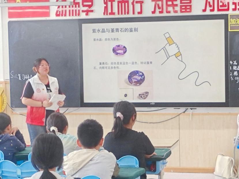 在正式宣讲的过程中,志愿者通过精美的图片和详细的讲解,带领同学们深入了解水晶的世界,感受大自然的鬼斧神工。志愿者协会成员考虑到同学们年龄尚小,多次优化宣讲内容,从水晶的基本情况、品种、特征、鉴别等方面介绍其独特魅力,寻找知识之间的关联,运用图片替代文字的方式帮助同学们理解晦涩难懂的专业知识,课堂上笑声与惊叹声不时响起。