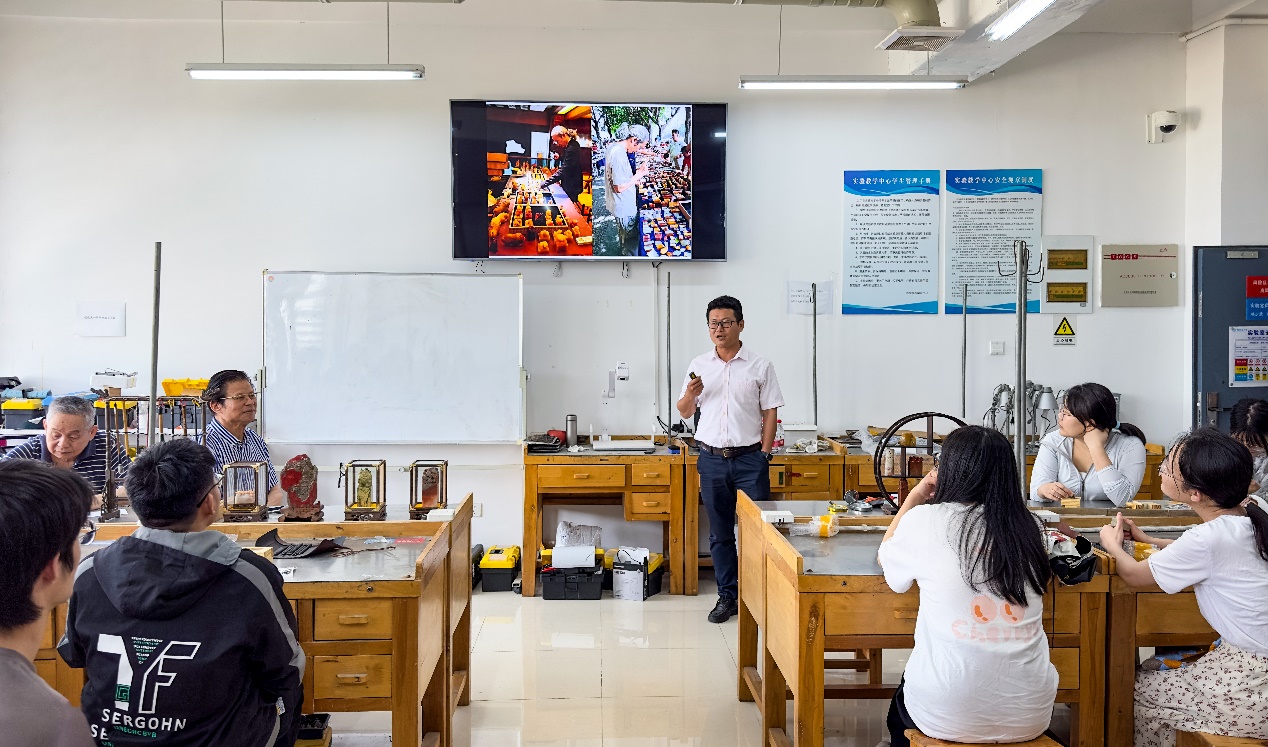 宋斌教授向同学们讲述了篆刻工艺的历史文化,并进行了工艺演示,让同学们对篆刻艺术的实际操作有了初步了解。在活动过程中,宋斌与同学们展开了热情的交流与指导,并针对同学们的印章作品现场给出了具体的意见。同学们受益匪浅,纷纷表示对篆刻艺术有了更深的理解和浓厚的兴趣。