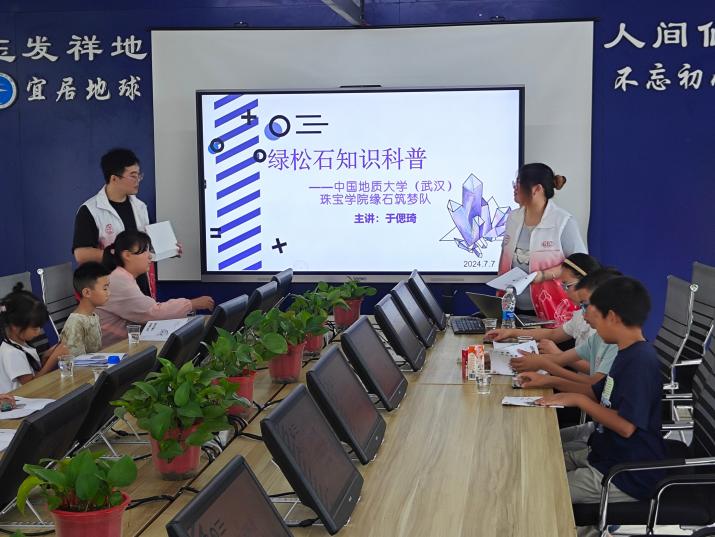 本次科普活动分为两个环节。首先,团队成员从绿松石的历史、文化、矿物学特征、分类以及资源保护等多个维度进行宣讲,介绍绿松石的独特魅力,提升小朋友对绿松石的认识。同时宣讲中强调绿松石资源的珍贵和不可再生性,提高大家的环境资源保护意识,共同维护绿松石资源的稳定和安全。团队成员在宣讲过程中设置了许多互动问答环节,激发了孩子们的参与热情,推动了绿松石科普活动的顺利进行。