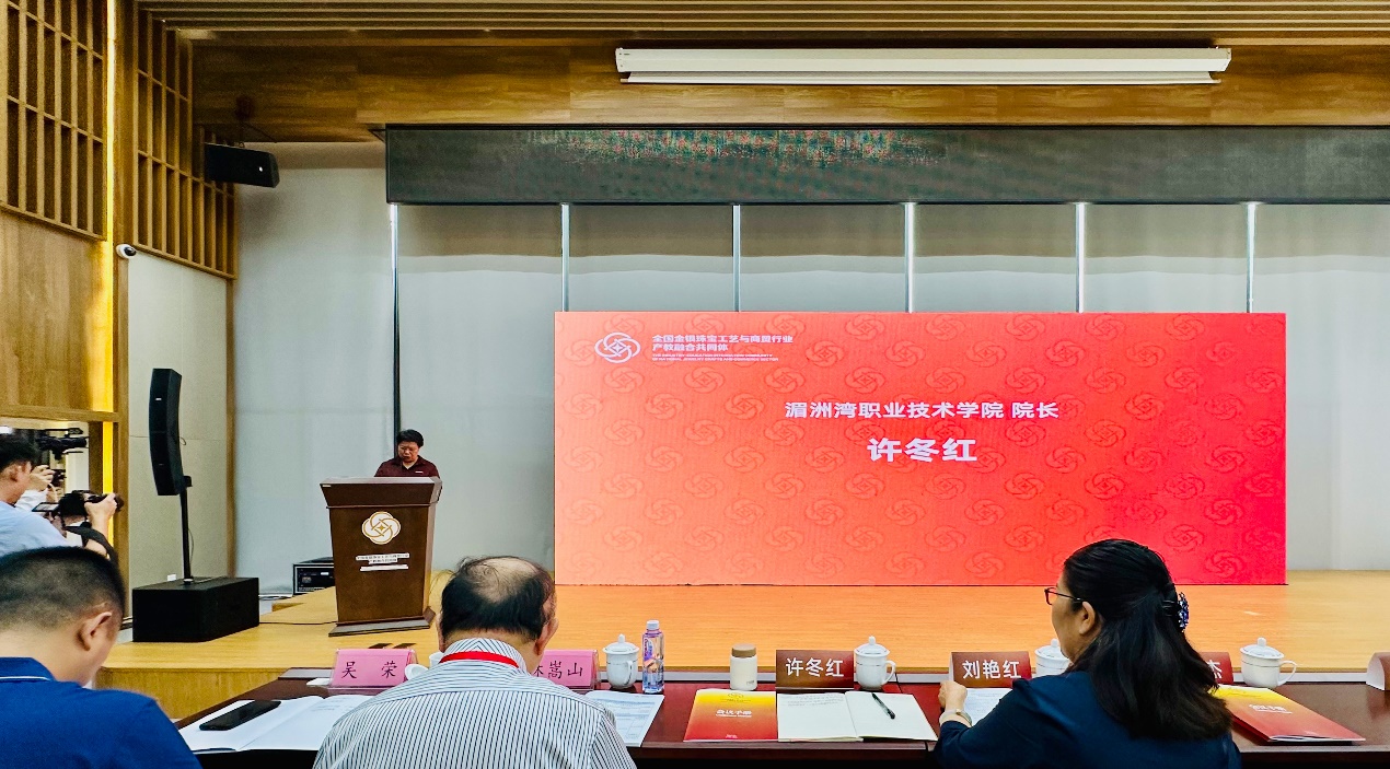 湄洲湾职业技术公司经理许冬红女士讲话。她表达了对共同体成立的坚定支持,并对产教融合所带来的积极变化充满信心和期待。许经理表示,湄洲湾职业技术公司将继续发挥自身优势,与共同体成员单位携手并进,共同推动金银珠宝工艺与商贸行业的高质量发展。
