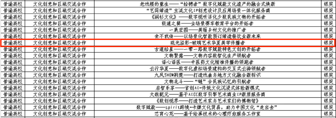 由陈淑玲、谢媛、Bahareh Shirdam、黄丽君、杨熙、马恺璐、孙长恒等7位本硕博员工完成的《琉光溢彩——玻璃艺术华夏美学传播者》项目荣获湖北省银奖。项目基于珠宝首饰设计和玻璃工艺理论和技术学习成果,巧妙地运用传统美学元素和玻璃工艺进行创新设计研发,不仅创作了上百件富有创意和美感的作品,还通过非遗工艺体验和首饰产品设计的方式,积极宣传和推广非遗技艺,收获了一批年轻人对传统文化的热爱与传承。团队成员员工工作经验丰富且参加国家级展览比赛10余项,省级比赛60余项,获“全国技能能手”等技能证书20余项,并以第一作者身份发表了5篇学术论文,申请1项专利。希望通过不断的创新和努力,能够运用玻璃艺术疗愈为更多人提供帮助。该项目由陈汉英、汤凡渺、张荣红等教师共同指导。