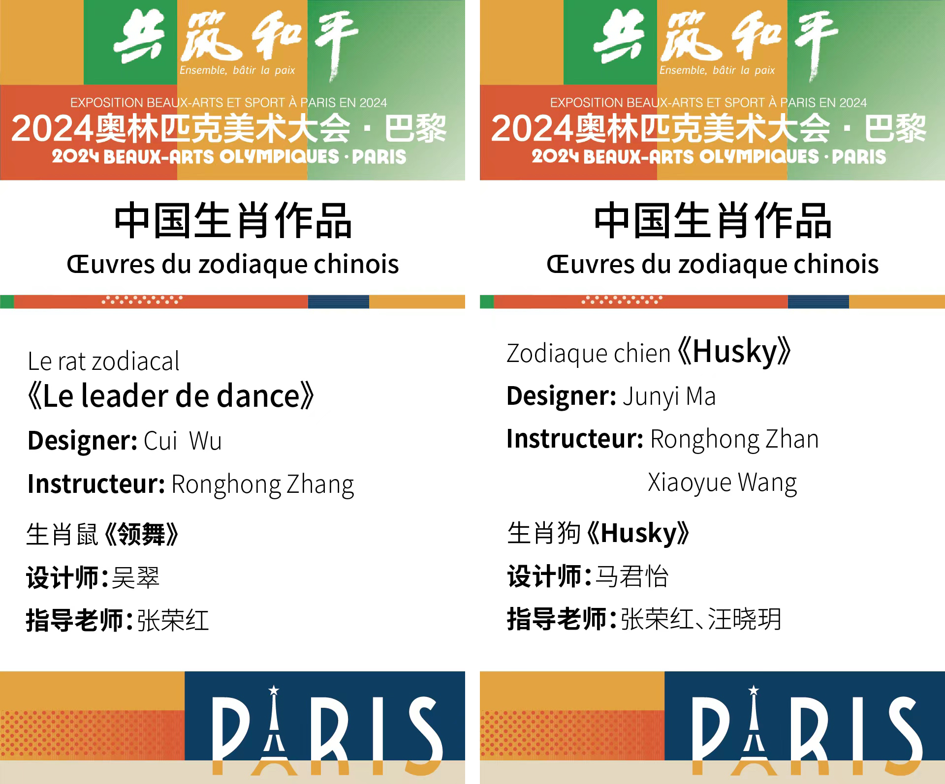 “共筑和平”——2024巴黎奥林匹克美术大会,于当地时间8月8日晚7时在巴黎塞纳国家音乐艺术中心盛妆启幕,由公司张荣红和汪晓玥两位老师指导,公司本科生吴翠和马君怡设计的生肖作品鼠年的《领舞》和狗年的《HUSKY》随同中华十二生肖雕塑受邀参加巴黎奥林匹克美术大会,其不仅是作品的惊艳,更是中国珠宝设计师们在国际舞台上的闪耀登场。展览结束,包含公司2件设计作品在内的这些十二生肖作品将被瑞士洛桑奥林匹克博物馆收藏。