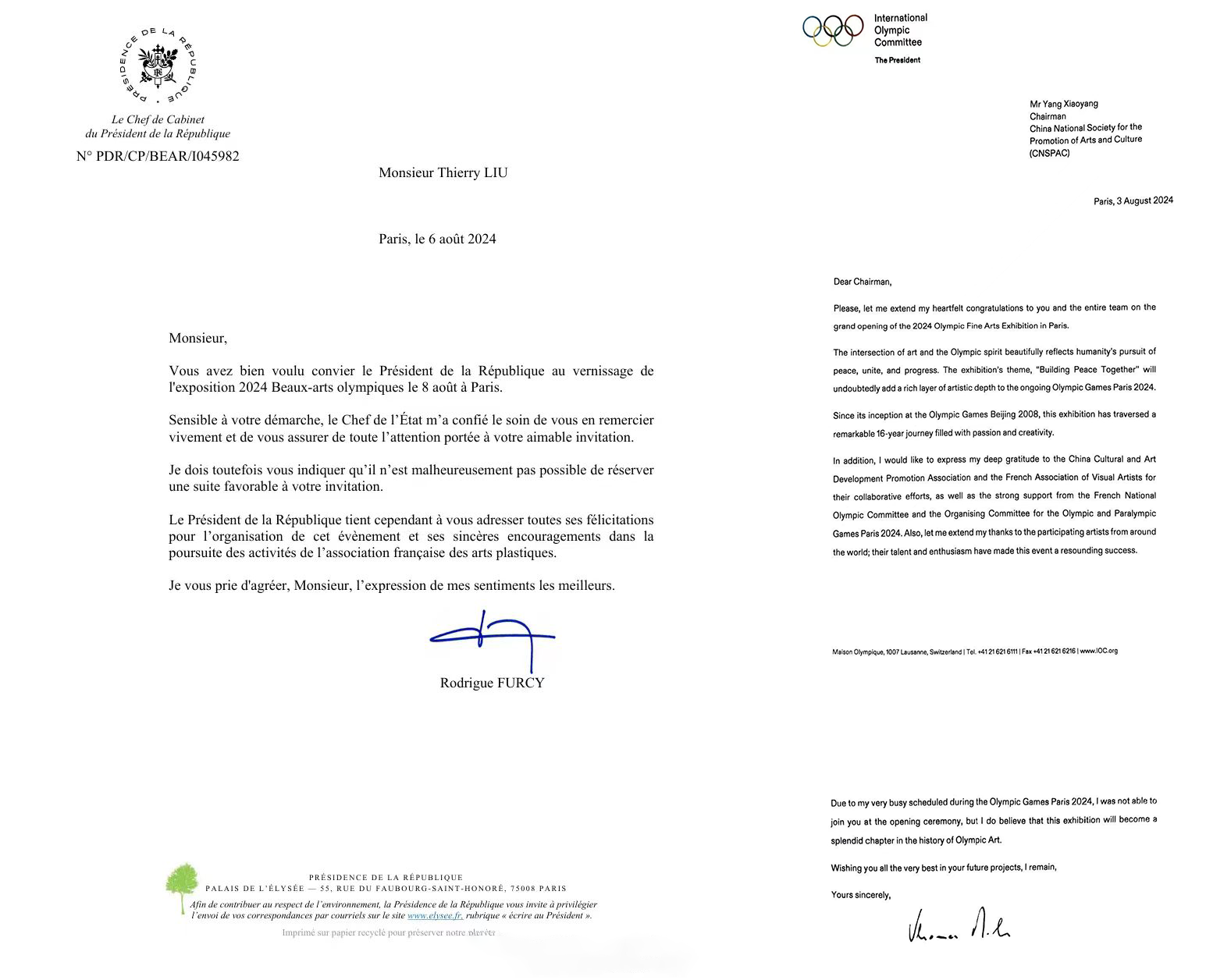 在开幕式上,国际奥委会副主席胡安·安东尼奥·萨马兰奇,国际奥委会委员、中国奥委会副主席于再清,中国驻法国大使馆临时代办陈栋公使、王健公参、王茵参赞,中国文促会主席杨晓阳,亚奥理事会副主席、体育委员会主席宋鲁增,法国奥委会首席文化官斯蒂凡·哈托、办公室主任弗朗索瓦·普利扎克、国际奥林匹克收藏家协会克里斯托弗先生等多位贵宾出席,并对展出的十二生肖作品给予了高度评价。中国驻法国大使馆临时代办陈栋公使称赞这组中华十二生肖元素完美诠释了当代的审美,在奥运赛事的同时,用独特的艺术语言传递着世界和平的价值主张。国际奥委会主席托马斯.巴赫给奥林匹克美术大会主席、中国文促会主席杨晓阳发来贺信:艺术与奥林匹克精神交相辉映,共同传递着人类对和平、团结与进步的追求。法国马克龙总统委托总统府办公厅主任发来贺信,对“奥林匹克美术大会”在巴黎的成功举办表示祝贺。