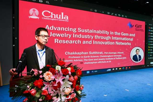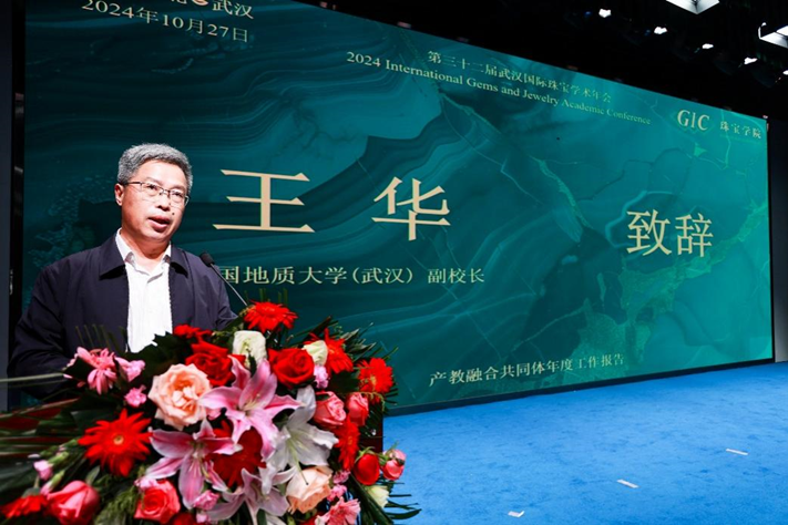 中国地质大学(武汉)党委常委、副董事长王华致开幕词。他提出,本次会议以“绿色未来,璀璨新生”为主题,表达了对珠宝行业可持续发展与创新引领的决心和展望,希望与会代表能够积极发表远见卓识,着力在政校企联合、科创项目聚合、产业链条整合、未来发展融合上谋发展,通过政府、高校、企业的联合,共同打造珠宝产业高质量发展的新模式;汇聚科技创新力量,共同攻关前沿项目;整合产业链上下游企业和科研机构的创新资源,解决行业关键难题;积极融入国内国际双循环,融合传统文化与现代科技,为珠宝行业的可持续发展注入新动能。