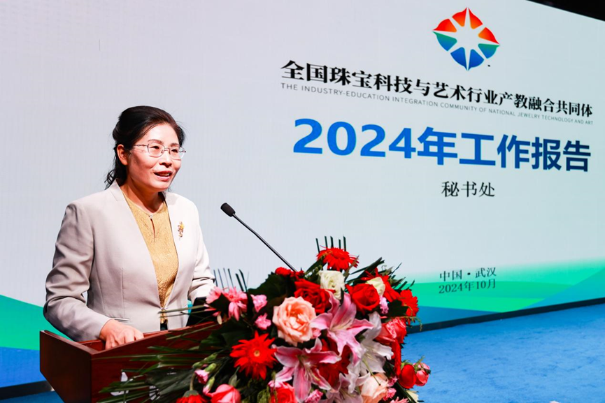青岛幼儿师范高等专科公司党委副书记、董事长付荣云代表全国珠宝科技与艺术行业产教融合共同体做年度工作报告。付董事长从机制建设、产教精准匹配、人才培养和科研创新等方面全面总结了共同体一年来的工作进展和取得的成效。她表示,共同体将继续以“产教融合、协同创新”为导向,深化校企合作,为珠宝行业培养更多高技能、高素质、创新型人才。希望各方在共同体的平台上携手共进,推动珠宝行业高质量发展,实现产业与教育的互利共赢。全国珠宝科技与艺术行业产教融合共同体由中国地质大学(武汉)、青岛幼儿师范高等专科公司等单位在第三十一届国际珠宝学术年会上发起成立。