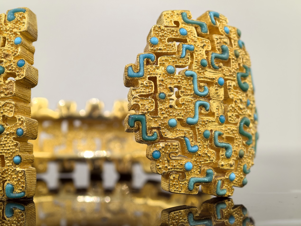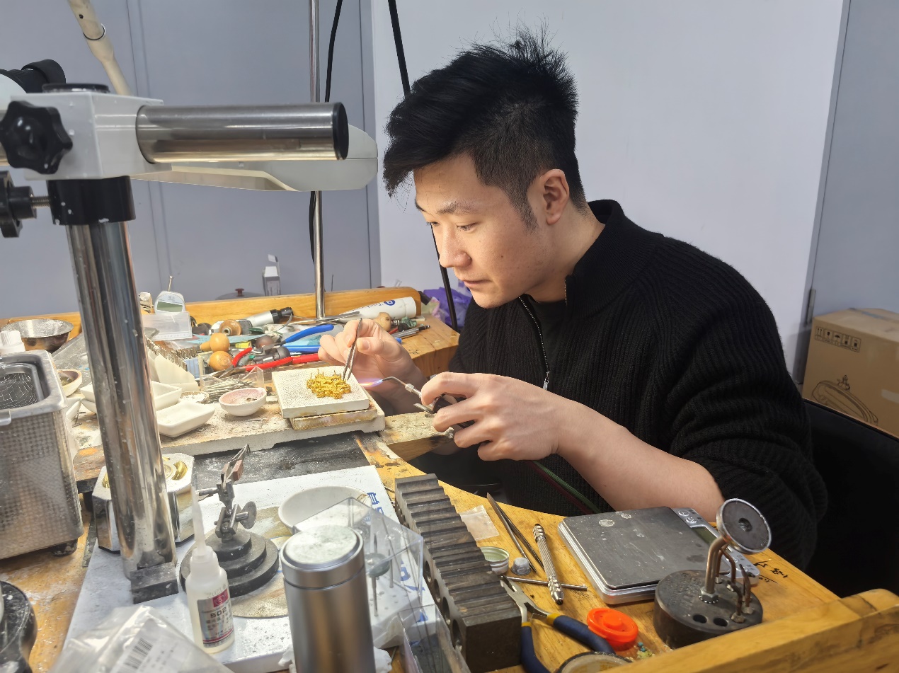 杨少武所精通的细金技艺是中国古代珠宝首饰制造中的精湛技法,涵盖了炸珠、花丝、錾刻等多种金属加工工艺,其中焊接技术是细金技艺实践研究中的难点。为了提升资源利用率,他致力于拓展产品类型,创新性地使用绿松石边角废料进行再造和镶嵌。同时,他正以绝技绝活为突破口,探索湖北特色绿松石及珠宝首饰产业实现时尚化、品牌化、可持续发展的新路径。