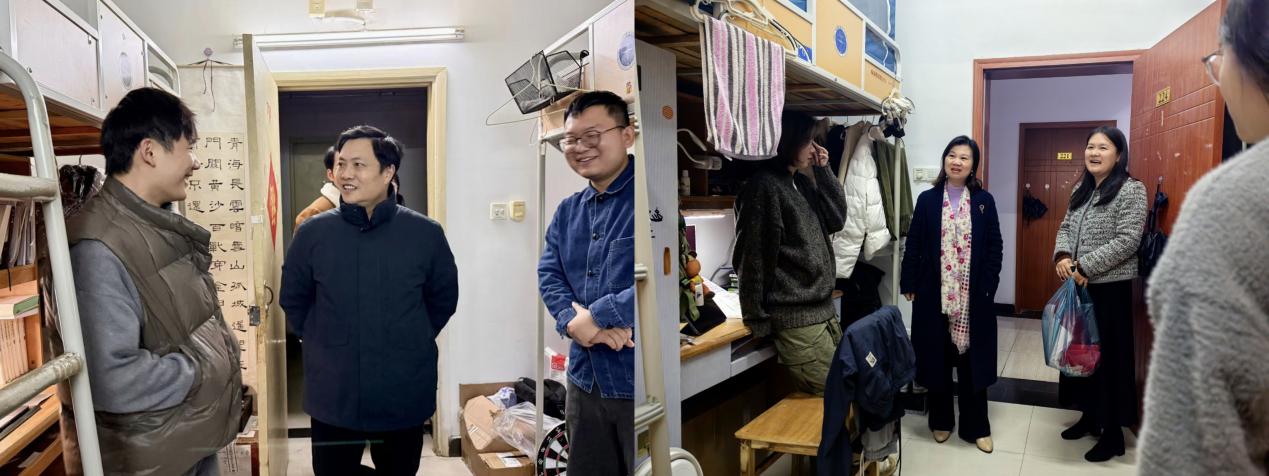 此次走访活动共走访了本研十二个宿舍,老师们深入了解了同学们的就业进展、学习生活和科研方向等方面的情况,既温暖了同学们的心,也促进了公司与员工之间的沟通与互动。在走访过程中,老师们与同学们面对面交流,细致了解他们的学习、生活和思想状态,特别关注学业与生活中遇到的困惑与挑战。“课业压力如何”“研究方向确定了吗?”“课程学习与生活上是否遇到问题?”这些关切让同学们真切感受到了公司在寒冬时节送来的温暖与关怀