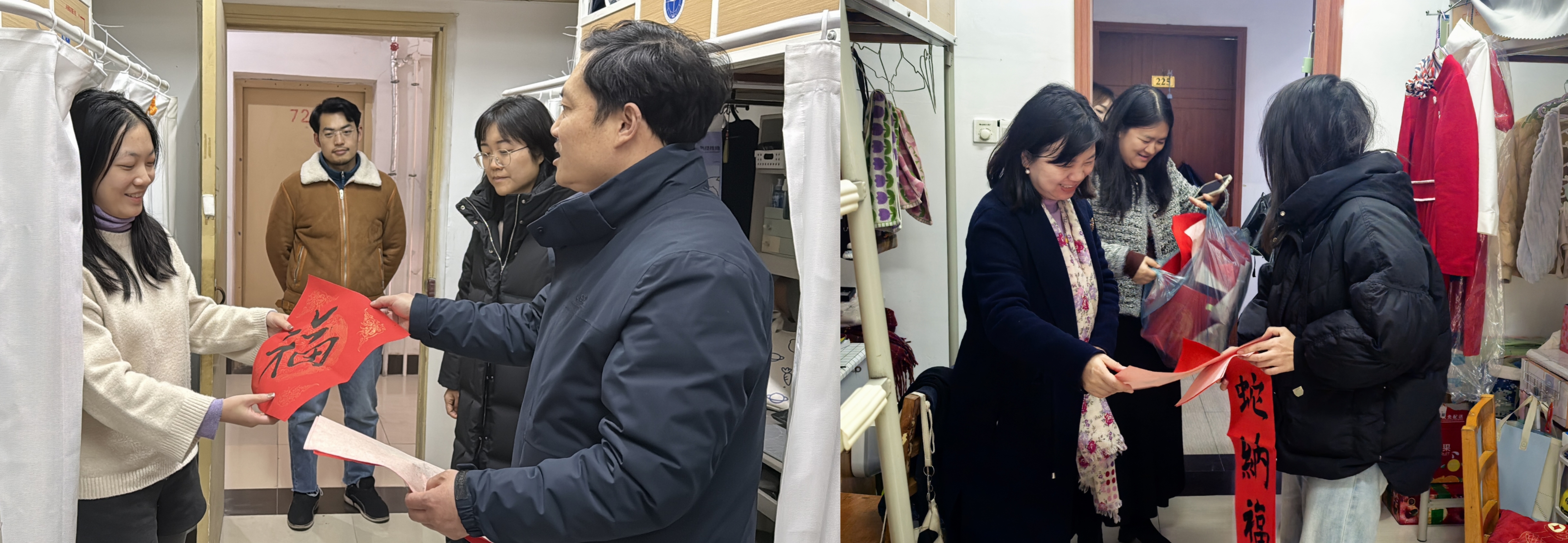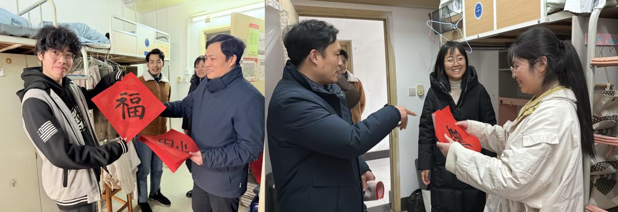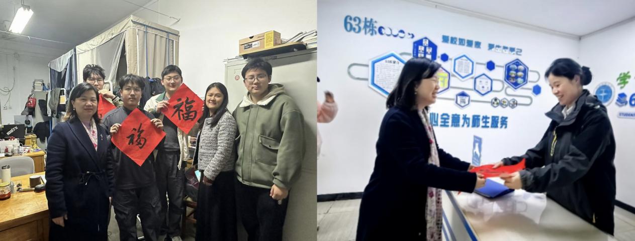 在走访最后,老师们还特别为每个宿舍送上了手写的“福”字,寄托着公司对同学们的美好祝福。每一张“福”字都代表着公司对同学们的关爱与期许,希望大家在新的一年里,学业进步、科研顺利、生活愉快。这份温暖的心意让同学们感受到浓浓的关怀,激励大家在未来的道路上勇敢前行、再创佳绩。 同时老师们也为63栋女寝宿管送去了祝福,冬至幸福至,老师们希望把这份幸福分享给每一个人,同时希望在这个寒冷的冬天里老师与同学们可以互相关怀,共同迎接美好幸福的明天!