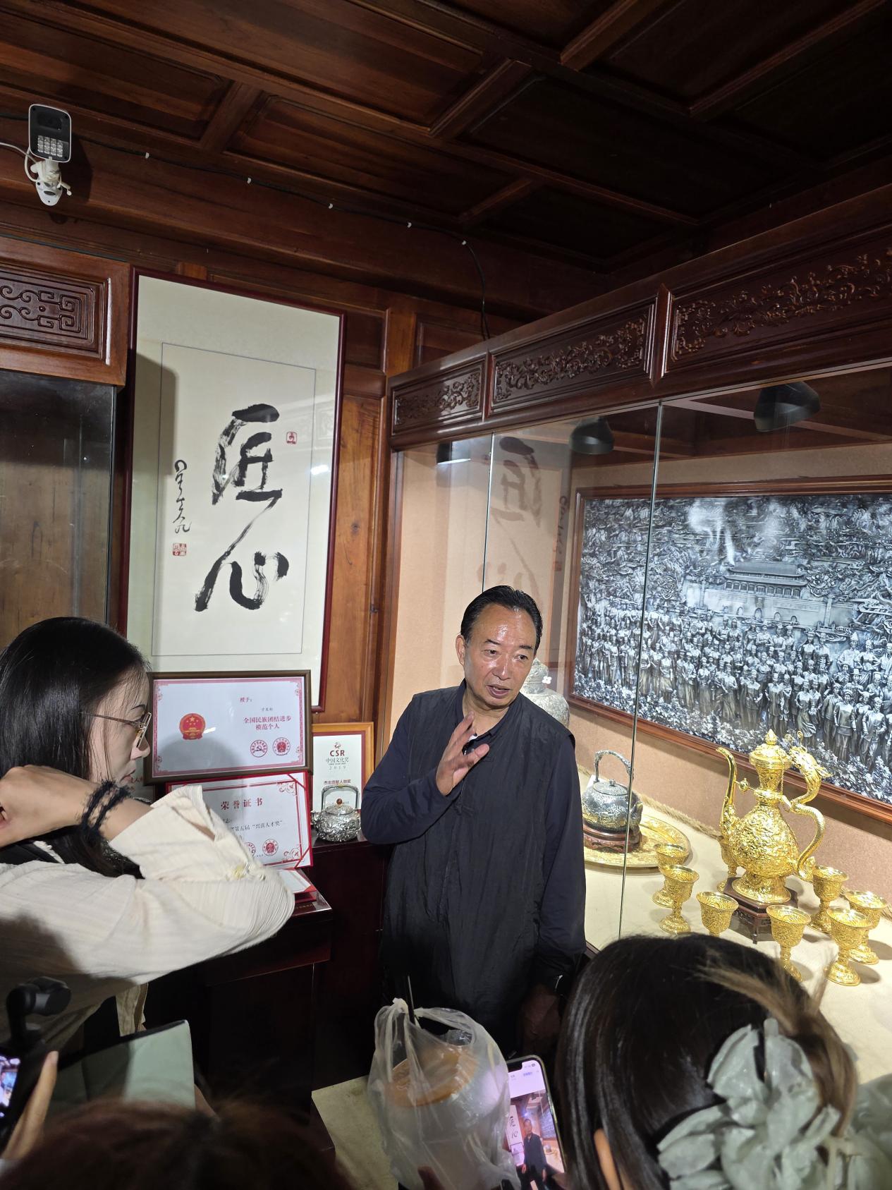 看到有同学锤打时手腕发颤,他接过锤头示范,锤头仿佛长在手上,轻触银料发出清脆的 “嗒嗒” 声,原本歪扭的银片慢慢舒展开来。休息时,他通过动作示意,自己打了几十年银,每天都在与银料对话,银料会因不当处理而变形,用心对待才能让它焕发光彩。