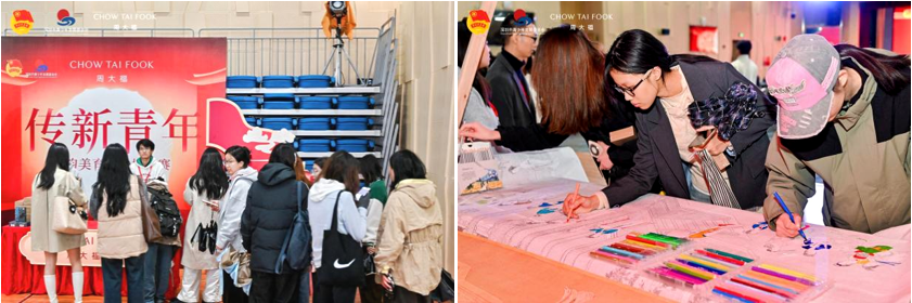10月20日,周大福「传新青年」校园宣讲会在beats365官方网站四楼报告厅正式启幕。会场入口处,同学们怀揣文化热忱与职业憧憬有序签名,领取周大福精心准备的手机支架伴手礼;现场特设的员工自由填色环节,让大家在亲手创作中感受传统色彩魅力,迅速点燃对这场非遗与职场碰撞盛宴的期待。本次宣讲会以“传新青年”为核心主题,通过高管分享、非遗传承者对话等环节,为珠宝学子搭建起了解行业前沿、传承文化根脉的优质平台。