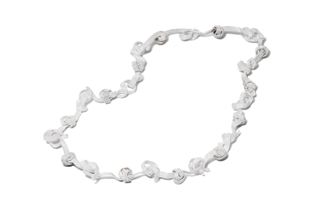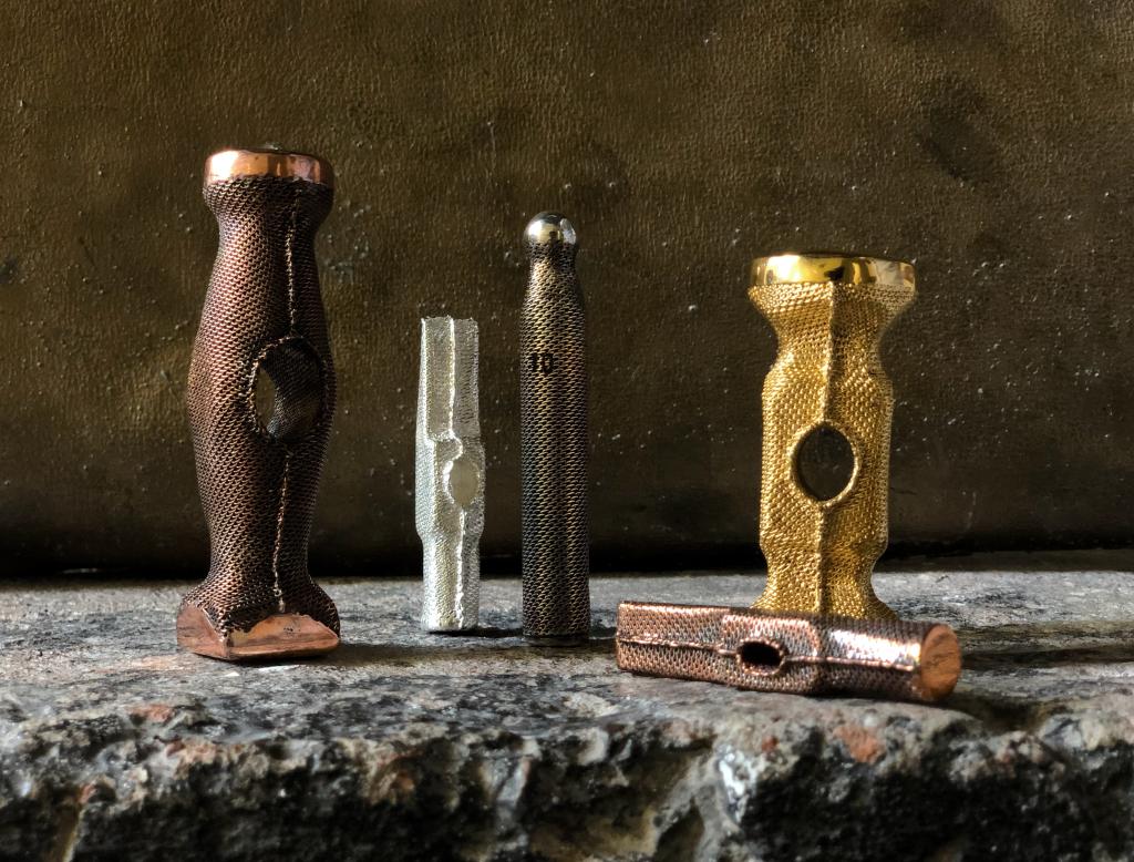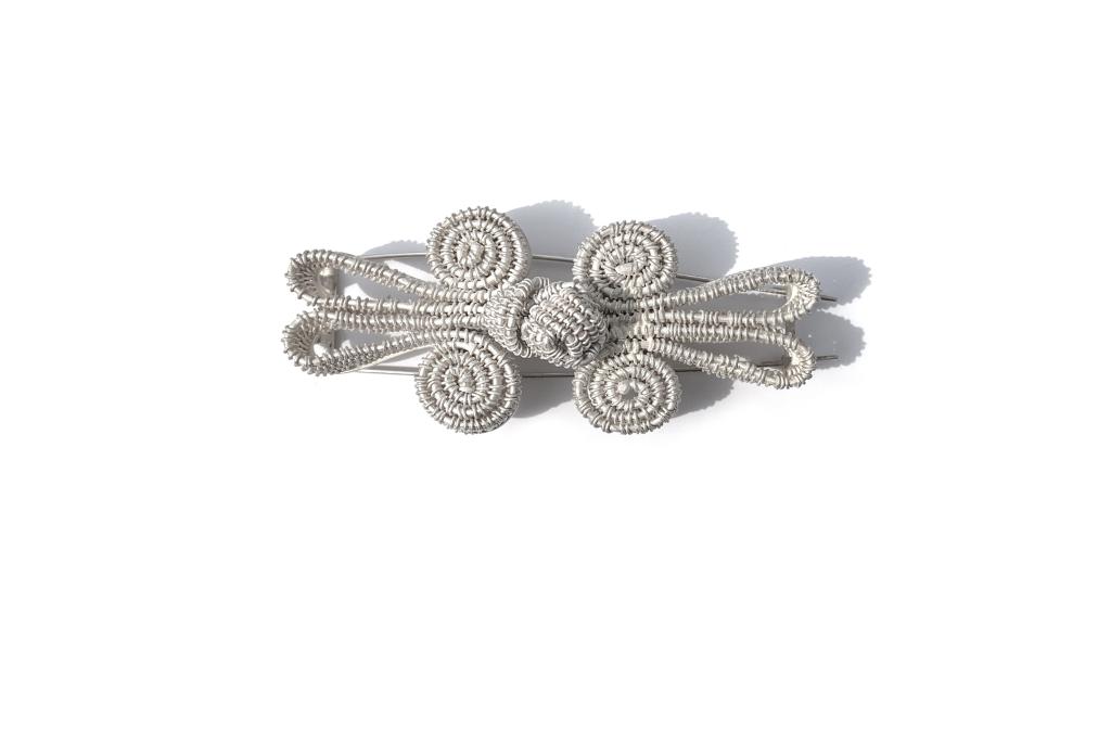 闫政旭老师创作构思:《行织有道》这套作品以金属编织作为主体工艺,其技法脱胎于传统细金工艺中的花丝工艺。其中“堆、累、编、织、掐、填、攒、焊”是该工艺的核心技法。此套作品将编、织、焊等技法运用到艺术创作当中,实现了传统工艺的现代设计转译,鉴古但不泥古,展示了创作者在传统工艺中寻求创新的探索精神。
