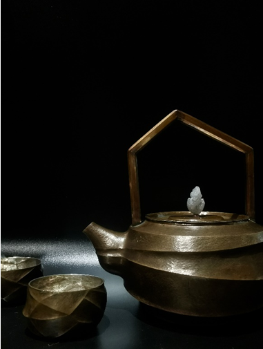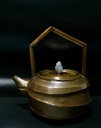 汪大江创作构思:作品《枯·山·水》在设计上借鉴了枯山水造园意境。壶体通过不断变化的线条来表现水的流动感,壶钮采用和田玉雕琢假山,以石代山。这些静止不变的“山、水”具有使人宁静的效果。器型以曲线表现水韵,金属流光予其动感。器物既是水的容载者,亦被水所幻化,水与器相生相成、互为因果。工艺上采用铜包银技艺,区别于一般的铜包银作品,该作品最大的难点亦是亮点在于通体不开孔,一层铜一层银一体锻打而成。