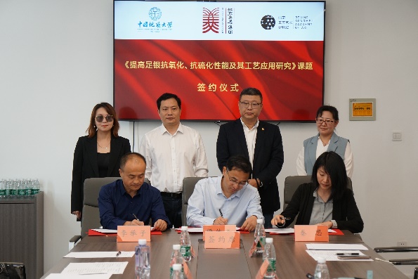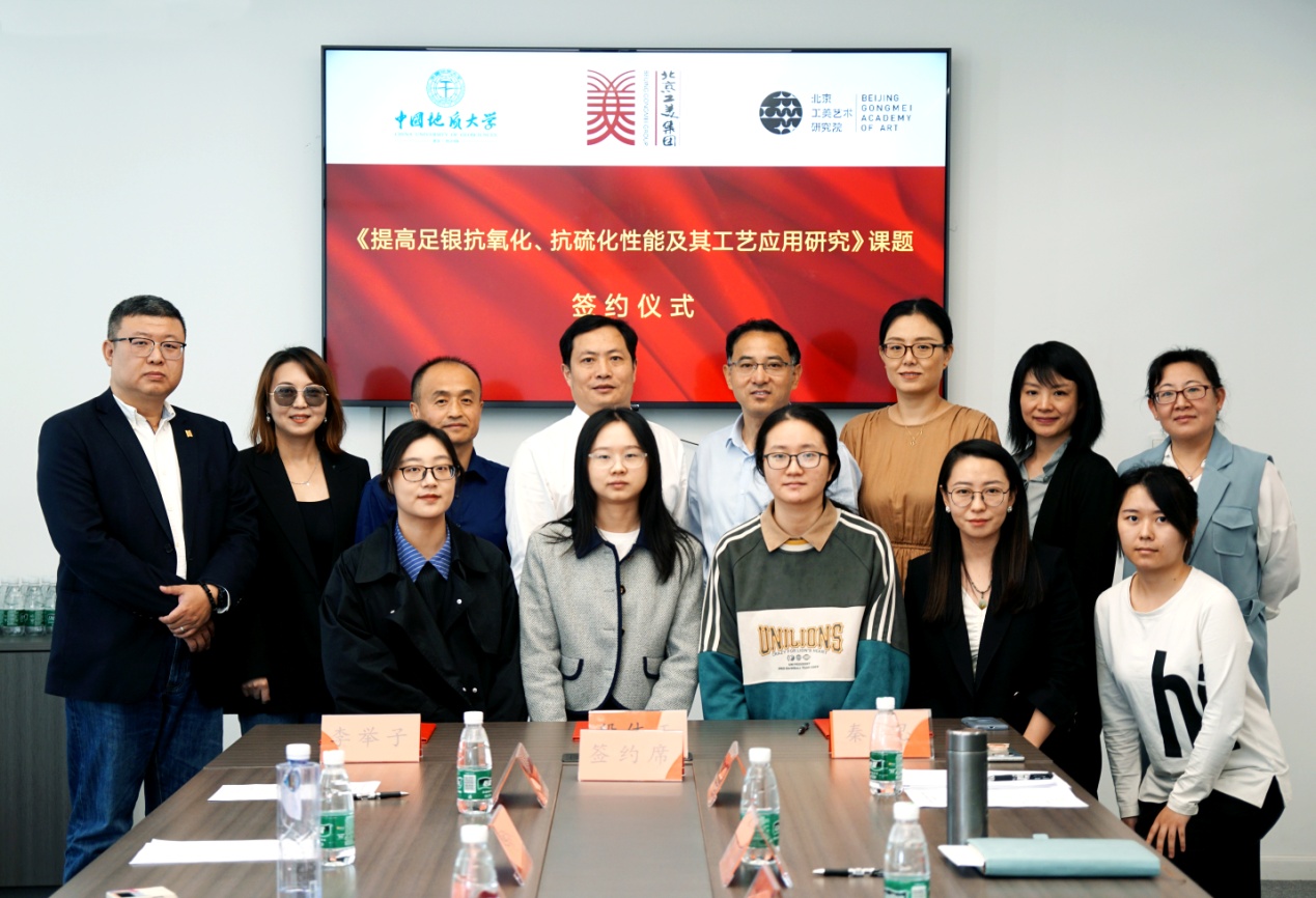 2023年10月16日,中国地质大学(武汉)公司党委书记薛保山,李举子教授科研团队,《宝石和宝石学杂志(中英文版)》编辑部主任黄艺兰一行在北京工美艺术研究院与北京工美集团、北京工美艺术研究院举行《提高足银抗氧化抗硫化性能及其工艺应用研究》科研项目签约仪式。北京工美集团党委书记、董事长段体玉,北京工美艺术研究院经理王晶晶,副经理秦思,研究员陈南,北京工美造办技术开发有限公司副总经理李博(主持工作),副总经理张莹,产品总监邢昊等参加签约仪式。经理王晶晶主持会议。段体玉、秦思、李举子分别代表集团、研究院和院校签署项目协议。