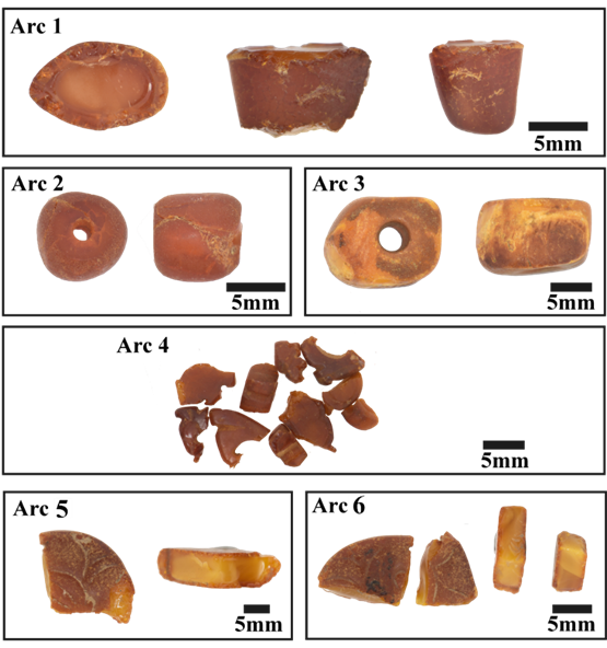 图2 本研究中所涉及的古代琥珀器物照片:Arc 1为宋代琥珀制品,Arc 2为明代琥珀制品,Arc 3~4为清代琥珀制品