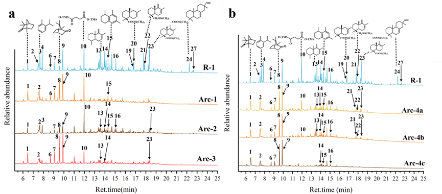 图4 通过Py-GC/MS分析的不同时期出土琥珀制品的总离子色谱图